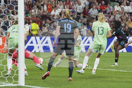 England's Michelle Agyemang, second right, takes a shot which hit the bar, during the Women's Euro 2025 semifinals soccer match between England and Italy at Stade de Geneve in Geneva, Switzerland, Tuesday, July 22, 2025. (AP Photo/Martin Meissner)