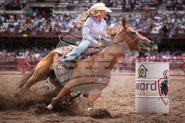 Halle Hladky from Gillette, Wyo. competes in barrell racing during the 129th anniversary Cheyenne Frontier Days Rodeo on Tuesday, July 22, 2025, in Frontier Park Arena in Cheyenne, Wyo. (Milo Gladstein/Wyoming Tribune Eagle via AP)