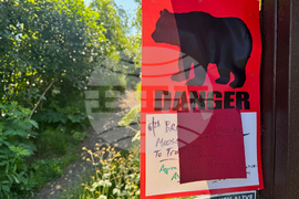 A bear warning sign is posted at the Basher trailhead in Anchorage, Alaska, on Wednesday, July 23, 2025, a day after a hiker was injured by a brown bear about two miles into the trail. (AP Photo/Mark Thiessen)