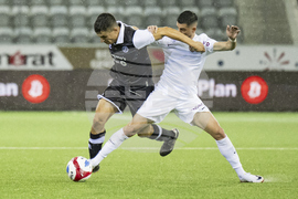 Lugano's Mattia Zanotti, left, fights for the ball with CFR's Meriton Korenicav, right, during the Europa League qualifying round soccer match between FC Lugano of Switzerland and CFR Cluj of Romania, Thursday, July 24, 2025, at the Stockhorn Arena stadium in Thun, Switzerland. (Anthony Anex/Keystone via AP)