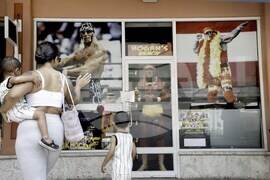 Teeyani Agudelo stops to wave goodbye to images of Hulk Hogan with her sons, Elijah Staffelbach, 1, and Elias Staffelbach, 3, outside of Hogan's Beach Shop in Clearwater Beach, Fla., Thursday, July 24, 2025, hours after it was announced that Terry Bollea, also known as Hulk Hogan, died. (Douglas R. Clifford/Tampa Bay Times via AP)