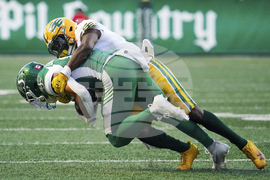 Edmonton Elks defensive back Kordell Jackson (top) tackles Saskatchewan Roughriders receiver Dhel Duncan-Busby (18) during the first half of CFL football action in Regina, on Friday, July 25, 2025. (Heywood Yu/The Canadian Press via AP)
