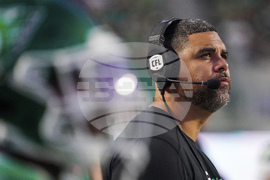 Saskatchewan Roughriders head coach Corey Mace looks on during the second half of a CFL football game against the Edmonton Elks in Regina, on Friday, July 25, 2025. (Heywood Yu/The Canadian Press via AP)