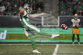 Saskatchewan Roughriders punter Joe Couch (70) punts the football against the Edmonton Elks during the second half of a CFL football game in Regina, on Friday, July 25, 2025. (Heywood Yu/The Canadian Press via AP)