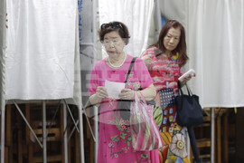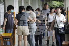 Voters emerge from voting booths at a polling station in Taipei, Taiwan, Saturday, July 26, 2025 as Taiwanese are casting their votes to determine whether to oust about one-fifth of their lawmakers, all from the opposition Nationalist Party, in elections. (AP Photo/Chiang Ying-ying)