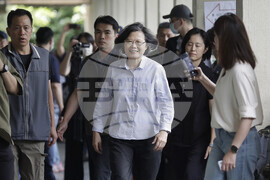 Former Taiwan President Tsai Ing-wen, center, goes to vote at a polling station in Taipei, Taiwan, Saturday, July 26, 2025 as Taiwanese are casting their votes to determine whether to oust about one-fifth of their lawmakers, all from the opposition Nationalist Party, in elections. (AP Photo/Chiang Ying-ying)