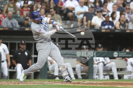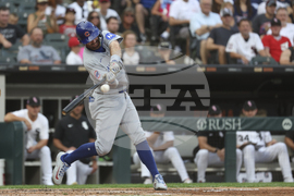 Chicago White Sox designated hitter Andrew Benintendi (23) singles during the first inning of a baseball game between the Chicago Cubs and Chicago White Sox, Saturday, July 26, 2025, in Chicago. (AP Photo/Talia Sprague)