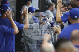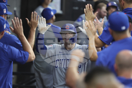 Chicago Cubs left fielder Ian Happ (8) walks back to the dugout after scoring on a walk during the eighth inning of a baseball game between the Chicago Cubs and Chicago White Sox, Saturday, July 26, 2025, in Chicago. (AP Photo/Talia Sprague)