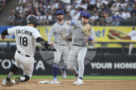 Chicago Cubs second baseman Nico Hoerner (2) turns a double play during the sixth inning of a baseball game between the Chicago Cubs and Chicago White Sox, Saturday, July 26, 2025, in Chicago. (AP Photo/Talia Sprague)