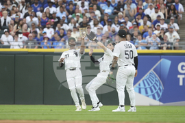 Chicago White Sox left fielder Michael A. Taylor (21) and center fielder Brooks Baldwin (27) battle for a catch during the sixth inning of a baseball game between the Chicago Cubs and Chicago White Sox, Saturday, July 26, 2025, in Chicago. (AP Photo/Talia Sprague)