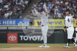 Chicago Cubs center fielder Pete Crow-Armstrong (4) celebrates after a double during the seventh inning of a baseball game between the Chicago Cubs and Chicago White Sox, Saturday, July 26, 2025, in Chicago. (AP Photo/Talia Sprague)