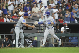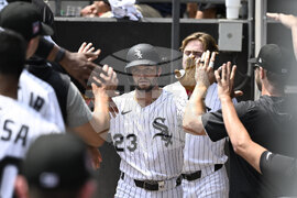 Chicago White Sox's Andrew Benintendi, right, high-fives Chase Meidroth (10) after they scored on Benintendi's three-run home run during the eighth inning of a baseball game against the Chicago Cubs, Sunday, July, 27, 2025, in Chicago. (AP Photo/Matt Marton)