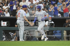 Chicago Cubs second baseman Nico Hoerner (2) celebrates a two run home run with third base coach Quintin Berry (0) during the seventh inning of a baseball game between the Chicago Cubs and Chicago White Sox, Saturday, July 26, 2025, in Chicago. (AP Photo/Talia Sprague)