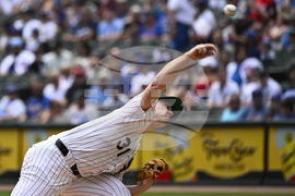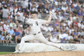 Chicago White Sox relief pitcher Tyler Alexander (70) throws during the sixth inning of a baseball game between the Chicago Cubs and Chicago White Sox, Saturday, July 26, 2025, in Chicago. (AP Photo/Talia Sprague)