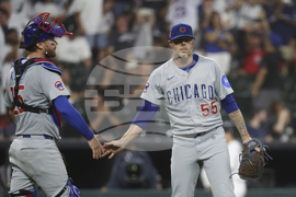 Chicago Cubs relief pitcher Ryan Pressly (55) and Chicago Cubs catcher Carson Kelly (15) celebrate a win over the Chicago White Sox, Saturday, July 26, 2025, in Chicago. (AP Photo/Talia Sprague)