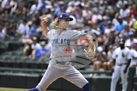Chicago Cubs starting pitcher Cade Horton (22) throws during the first inning of a baseball game between the Chicago Cubs and Chicago White Sox, Saturday, July 26, 2025, in Chicago. (AP Photo/Talia Sprague)