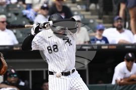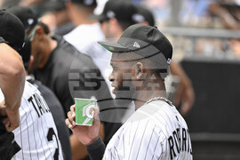 Chicago White Sox outfielder Luis Robert Jr. stands in the dugout during the first inning of a baseball game against the Chicago Cubs, Sunday, July, 27, 2025, in Chicago. (AP Photo/Matt Marton)