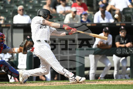 Chicago White Sox shortstop Chase Meidroth (10) flys out during the third inning of a baseball game between the Chicago Cubs and Chicago White Sox, Saturday, July 26, 2025, in Chicago. (AP Photo/Talia Sprague)
