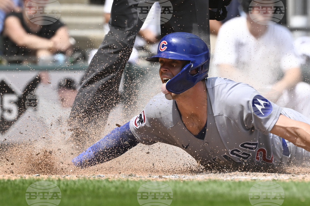 Chicago Cubs' Nico Hoerner scores during the sixth inning of a baseball game against the Chicago White Sox, Sunday, July, 27, 2025, in Chicago. (AP Photo/Matt Marton)