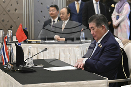 Thailand's acting Prime Minister Phumtham Wechayachai takes part in talks with Cambodia's Prime Minister Hun Manet, mediated by Malaysia's Prime Minister Anwar Ibrahim, on a possible ceasefire between Thailand and Cambodia in Putrajaya Monday, July 28, 2025.(Mohd Rasfan/Pool Photo via AP)