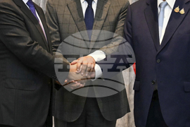Cambodia's Prime Minister Hun Manet, left and Thailand's acting Prime Minister Phumtham Wechayachai, right shake hands as Malaysia's Prime Minister Anwar Ibrahim gestures after talks on a possible ceasefire between Thailand and Cambodia in Putrajaya, Malaysia, Monday, July 28, 2025. (Mohd Rasfan/Pool Photo via AP)