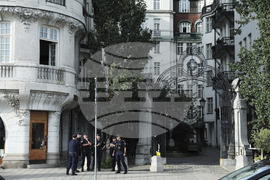 Police guard outside Hotel Diplomat during trade talks between the US and China in Stockholm, Sweden, Monday, July 28, 2025. (Caisa Rasmussen/TT News Agency via AP)