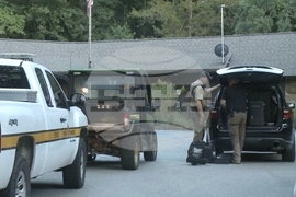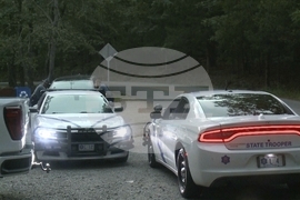 In this image made from video taken on Saturday, July 26, 2025, provided by KHBS/KHOG, Law enforcement officers investigate the deaths of a couple who were attacked while on a wooded walking trail with their two young daughters at Devil's Den State Park in West Fort, Ark. (KHBS/KHOG via AP)