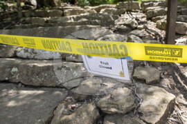 The trail head to the lower section of the Devil's Den trail at Devil's Den State Park remains closed Monday, July 28, 2025, in West Fork, Ark., as police search for a suspect in the deaths of a couple who were attacked while on a wooded walking trail. (AP Photo/Michael Woods)