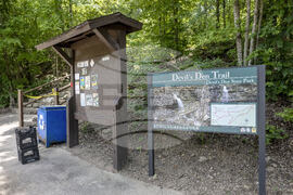 This May 2020 photo provided by Stephen O’Connell shows a sign for a hiking trail at Devil's Den State Park in West Fork, Ark. (Stephen O’Connell via AP)