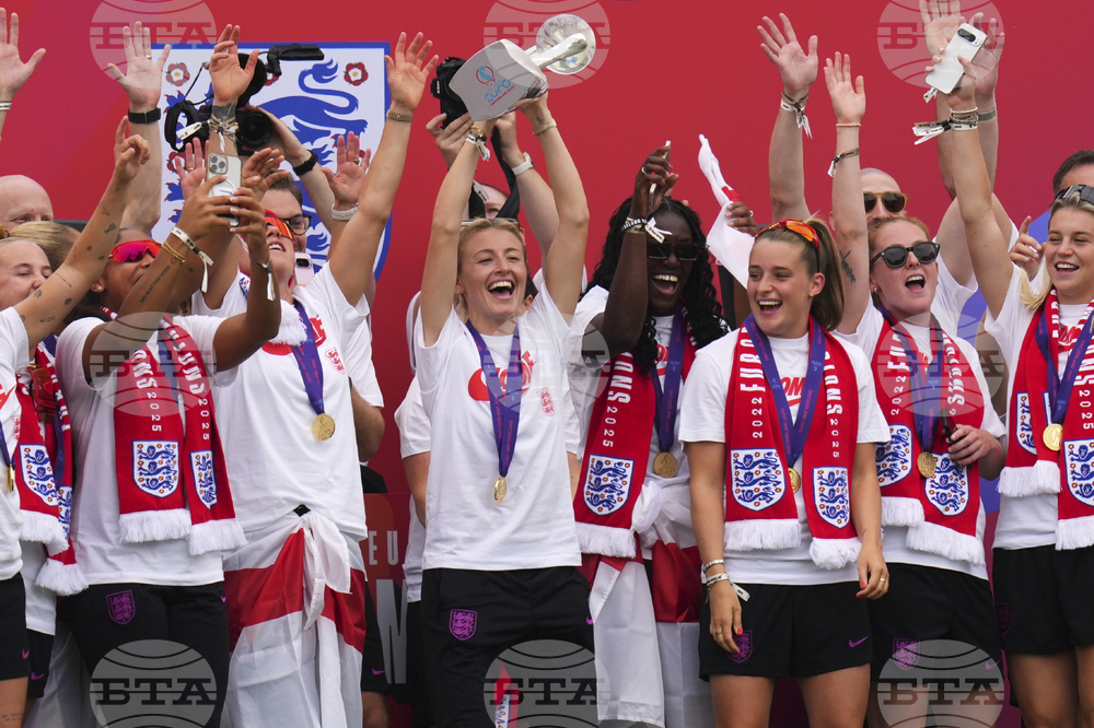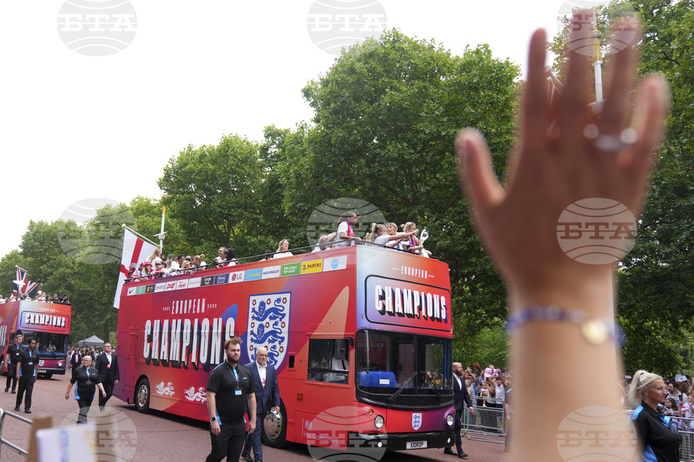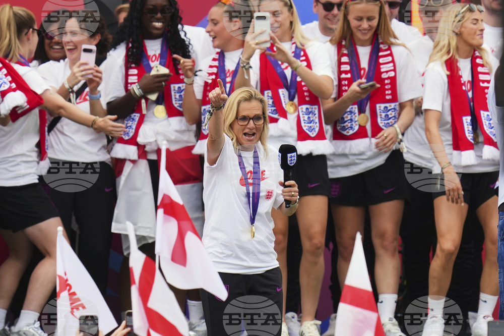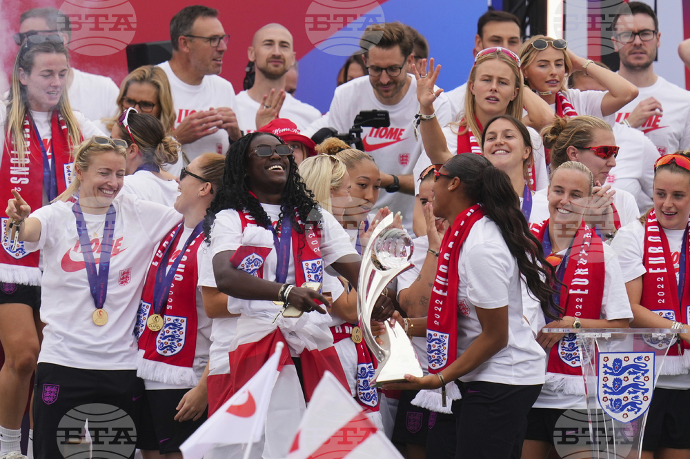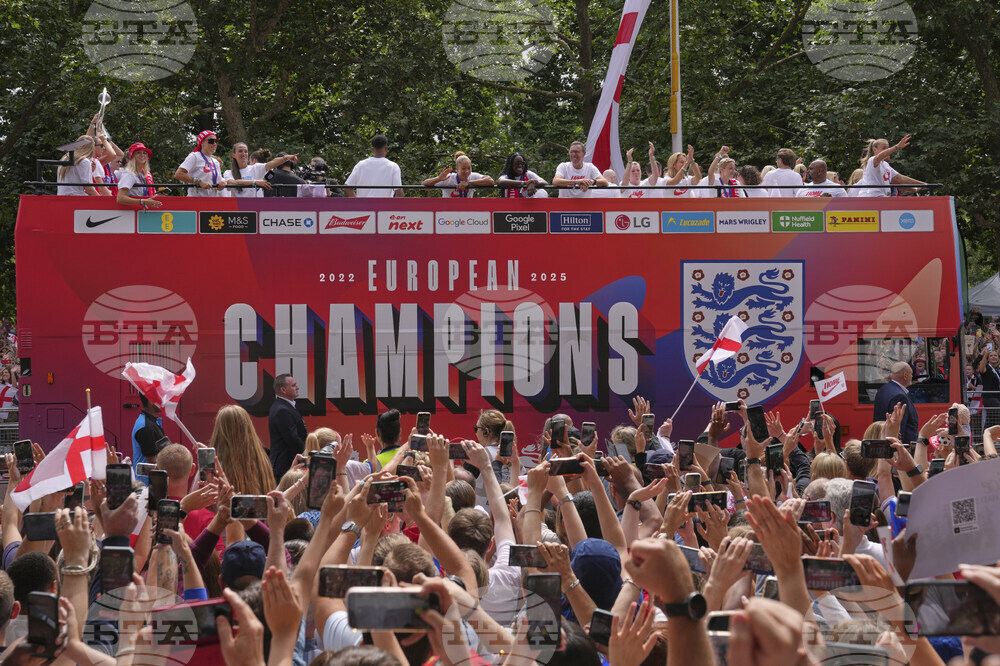 England's soccer players celebrate with fans during an open-top bus procession and ceremony in central London, Tuesday, July 29, 2025 after their victory in the Women's EURO 2025 final.(AP Photo/Joanna Chan)