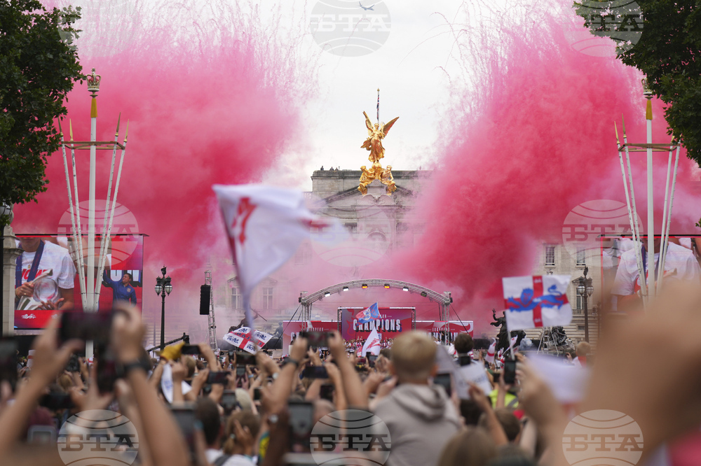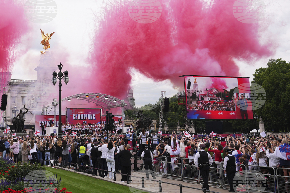 England's soccer players on a stage celebrate with thousands of fans during a homecoming victory parade and celebration outside Buckingham Palace in London, after winning the Women's Euro 2025,Tuesday, July 29, 2025.(AP Photo/Kirsty Wigglesworth)