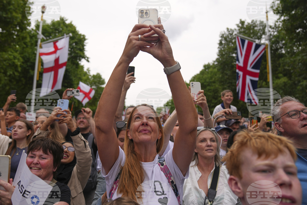 England's soccer players celebrate with fans during a ceremony on a stage in front of Buckingham Palace in central London, Tuesday, July 29, 2025 after their victory in the Women's EURO 2025 final.(AP Photo/Kin Cheung)