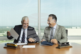 In this photo provided by Union Pacific shows from left, Union Pacific CEO Jim Vena shakes hands with Norfolk Southern CEO Mark George at the meeting where both men signed the agreement to merge the two railroads they lead to create the first transcontinental railroad in the United States on Monday, July 28, 2025 in Omaha, Neb. (Bill Sitzmann/Union Pacific via AP)