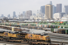 FILE - Los Angeles skyline is seen above the Union Pacific LATC Intermodal Terminal is seen on Tuesday, April 25, 2023 in Los Angeles. (AP Photo/Damian Dovarganes, File)