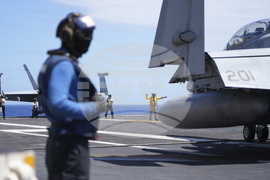 A catapult officer, right, gestures on the flight deck of the aircraft carrier USS Gerald R. Ford during military exercises in the Mediterranean off the coast of Naples, Italy, Tuesday, July 29, 2025. (AP Photo/Andrea Rosa)