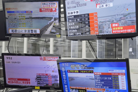 TV monitors show news flash after a powerful earthquake in Russia's Far East prompted tsunami warnings in parts of Japan, in Osaka, western Japan Wednesday, July 30, 2025. (Kai Naito/Kyodo News via AP)