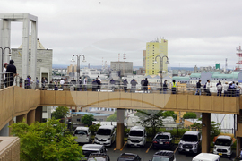 People who evacuated to Hiyoriyama mountain watch toward the sea in Ishinomaki, Miyagi prefecture, northern Japan Wednesday, July 30, 2025 after a powerful earthquake in Russia's Far East prompted tsunami alert in parts of Japan. (Muneyoshi Someya/Kyodo News via AP)