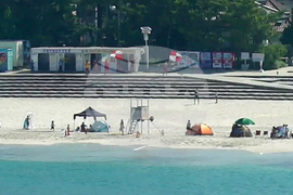 In this image taken from a fixed position video, peopel wave tsunami warning flags, seen at the background, to beachgoers immidiately after a strong earthquake near Russia’s Kamchatka Peninsula, in Shirahama, Wakayama prefecture, western Japan Wednesday, July 30, 2025. (Kyodo News via AP)