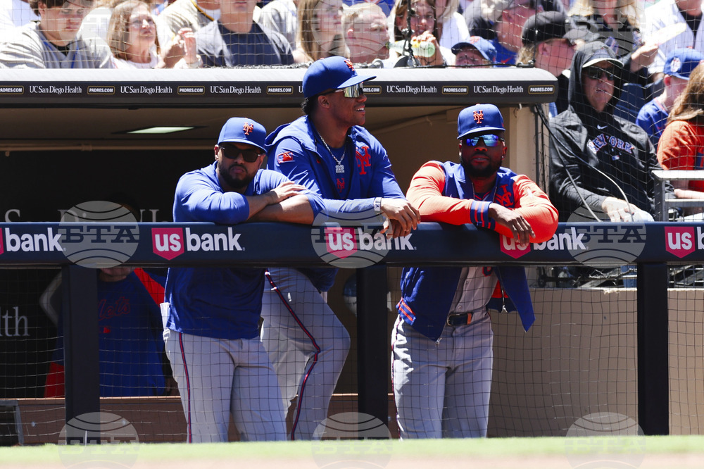 New York Mets' Juan Soto, center, looks on from the dugout during a baseball game against the San Diego Padres Wednesday, July 30, 2025, in San Diego. (AP Photo/Derrick Tuskan)