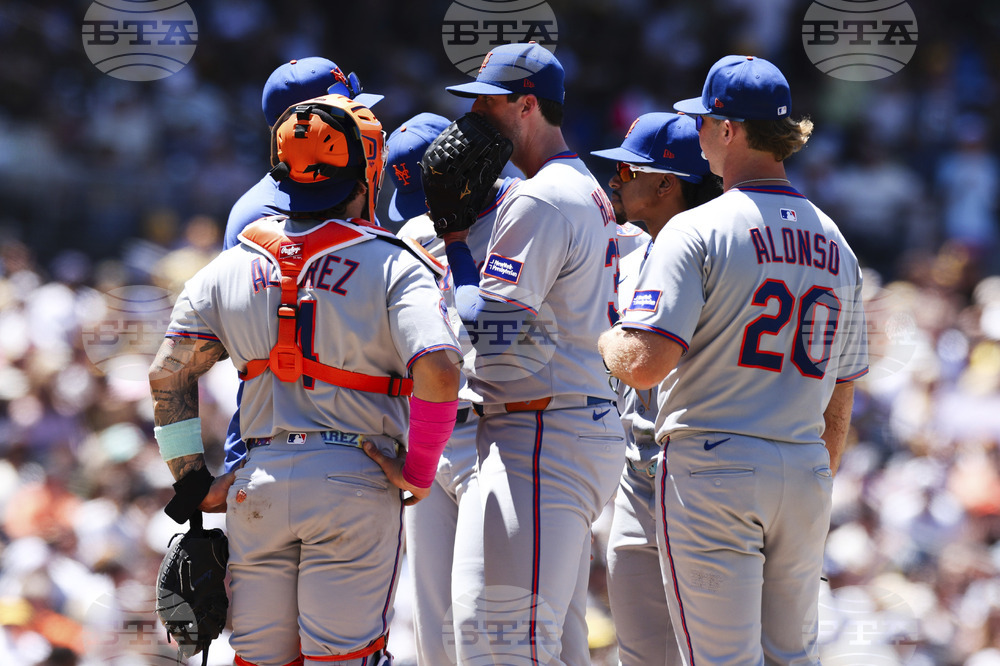 New York Mets' Clay Holmes, center, is visited at the mound by the infield and pitching coach in the third inning of a baseball game against the San Diego Padres Wednesday, July 30, 2025, in San Diego. (AP Photo/Derrick Tuskan)