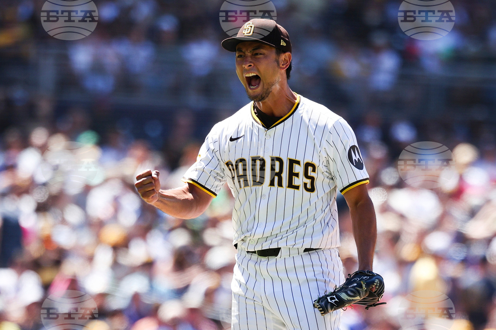 San Diego Padres' Yu Darvish reacts after striking out New York Mets' Mark Vientos to end the sixth inning of a baseball game, Wednesday, July 30, 2025, in San Diego. (AP Photo/Derrick Tuskan)