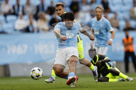 Malmö's Sead Hakšabanović scores a goal during the Champions League qualifying round soccer match between Sweden's Malmö FF and Latvia's RFS, Wednesday, July 30, 2025, in Malmö, Sweden,. (Andreas Hillergren/TT News Agency via AP)