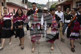 Aristides Guerrero, center left, and Hugo Aguilar, center right, who have been elected to Mexico's Supreme Court, attend a ceremony in Tenejapa, Mexico, Wednesday, July 30, 2025. (AP Photo/Isabel Mateos)