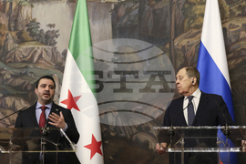 Syrian Foreign Minister Asaad Hassan al-Shibani attends a joint news conference with Russian Foreign Minister Sergey Lavrov following their meeting in Moscow, Russia, Thursday, July 31, 2025. (Shamil Zhumatov/ Pool Photo via AP)
