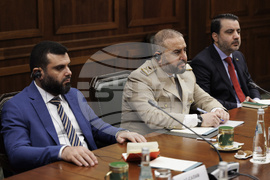 In this photo released by Russian Defense Press Service, Russian Defense Minister Andrei Belousov, right, speaks with Syrian Foreign Minister Asaad al-Shibani, left, and Syrian Defense Minister Murhaf Abu Qasra, second left, during their meeting in Moscow, Russia, Thursday, July 31, 2025. (Dmitri Harchikov, Russian Defense Ministry Press Service via AP)