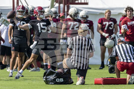 Alabama quarterback Ty Simpson (15) works through drills during an NCAA college football practice, Thursday, July 31, 2025, at the Thomas-Drew Practice Fields in Tuscaloosa, Ala. (AP Photo/Vasha Hunt)
