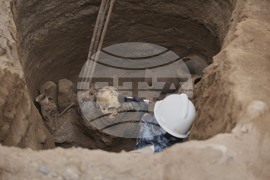 Archaeologist Jose Aliaga works at the site where city workers discovered an ancient mummy, from the pre-Inca Chancay culture, and artifacts as workers were digging a natural gas line for the company Calidda in the district of Puente Piedra on the outskirts of Lima, Peru, Thursday, July 31, 2025. (AP Photo/Guadalupe Pardo)