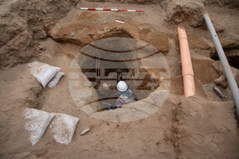 Archaeologist Jose Aliaga works at the site where city workers discovered ancient remains, from the pre-Inca Chancay culture, and artifacts as workers were digging a natural gas line for the company Calidda in the district of Puente Piedra on the outskirts of Lima, Peru, Thursday, July 31, 2025. (AP Photo/Guadalupe Pardo)
