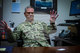 FILE - Capt. David Thames, Surface Fleet Atlantic (SURFLANT) Force chaplain of the U.S. Navy, speaks about the Navy's plan to assign additional chaplains permanently to Navy support surface ships at his office at Norfolk Naval Station in Norfolk, Va. on Monday, March 13, 2023. (AP Photo/John C. Clark, File)