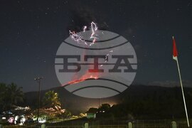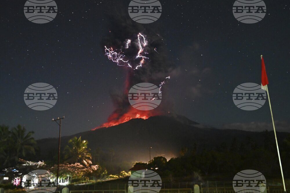 In this photo released by Geological Agency (Badan Geologi) of the Indonesia's Ministry of Energy and Mineral Resources, lightning strikes as Mount Lewotobi Laki-Laki spews volcanic material during an eruption in East Flores, Indonesia, Friday, August. 1, 2025. (Badan Geologi via AP)
